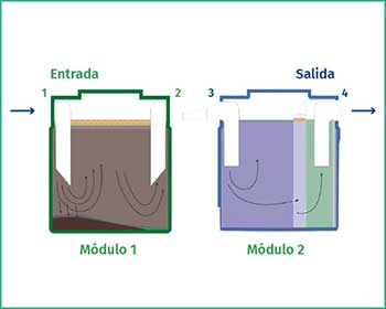 El Biodigestor separa los lodos del agua, mediante la digestión anaerobia el agua es recibida por un filtro anaerobio. Finalmente se produce la salida de agua tratada a un pozo de absorción, zanja de filtración o campo de oxidación.
